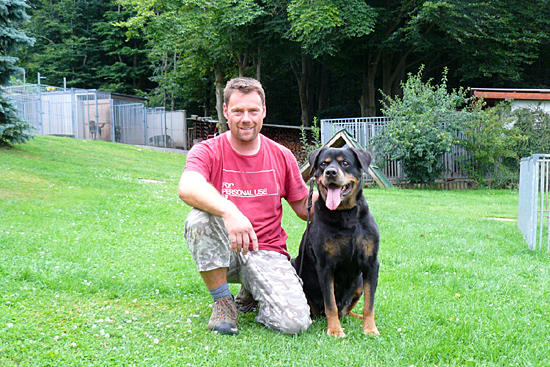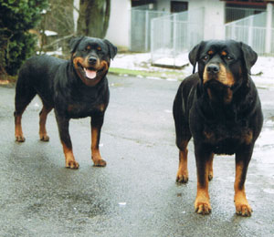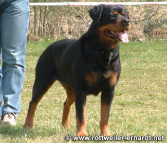 High sized, powerful, with typical head, heavy bones, pronounced stop, wide muzzle, large and correct carried ears, darkbrown eyes, strong neck, straight back correct chest, forehand correct angulation, with straight stand, toes well knuckled up, hindquarters correct angulation, correct standing, robust coat, red-brown markings above right partially broken, natural gait, dark mouthpigments. | |||