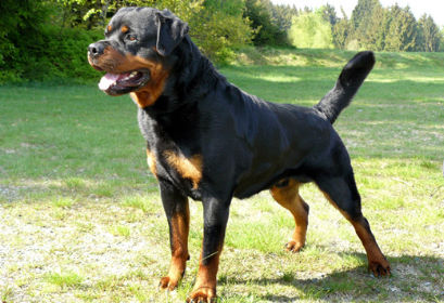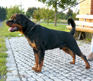 Attentive, friendly, georgious male with a typical head, heavy bones, perfect good wituated ears. Darkbrown perfect eyes, dark pigments and gum. Short heavy throat, perfect stop. Excellent topline, chest am angulation. Shiny coat with correct mark. Excellent walker and runner. | |